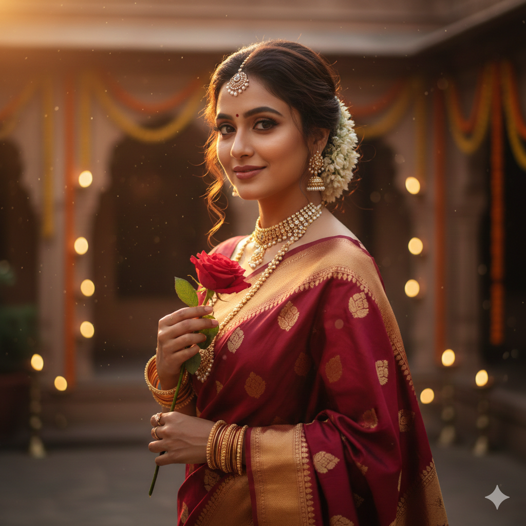 Generate an ultra-realistic 8K cinematic portrait of a 24-year-old Indian woman dressed in a traditional red silk saree with ethnic jewelry. Pose: standing straight, rose held gracefully. Expression: cultural pride with gentle smile. Lighting: warm natural daylight. Details: rich silk texture, jewelry shine, realistic shadows. Camera: DSLR, cinematic depth.