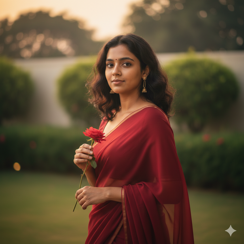 Create an ultra-realistic 8K cinematic portrait of a 23-year-old Indian woman wearing a classic red saree with soft pleats and subtle gold border. She is standing calmly in an elegant outdoor setting. Pose: upper-body portrait, shoulders relaxed, holding a single red rose gently in her right hand. Expression: graceful, romantic, confident smile. Lighting: soft golden-hour sunlight illuminating her face evenly. Details: natural makeup, visible skin texture, sharp eyes, realistic fabric folds. Camera: professional DSLR, 85mm lens, shallow depth of field, cinematic color grading.