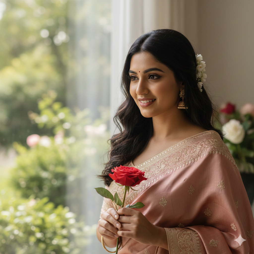 Create an ultra-realistic 8K cinematic portrait of a 22-year-old Indian woman wearing a saree. Pose: rose in hand, soft smile. Lighting: diffused natural light. Style: gentle romantic portrait.