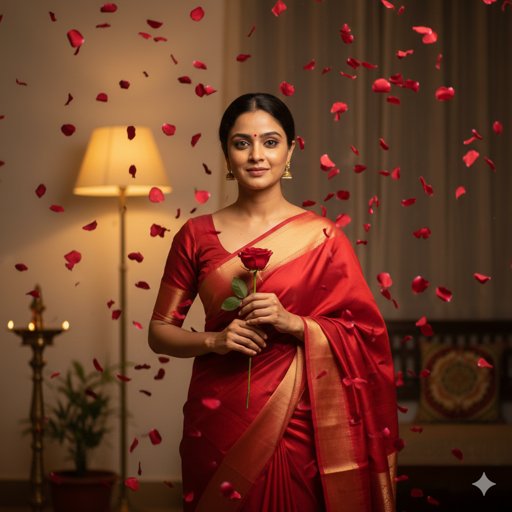 Create a cinematic ultra-realistic 8K portrait of a 23-year-old Indian woman wearing a red saree, surrounded by slow-falling rose petals. Pose: rose close to heart. Lighting: dramatic soft lighting. Mood: emotional romance. Camera: DSLR, movie-scene feel.