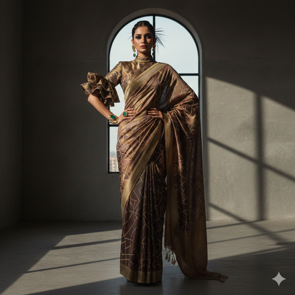 Create an ultra-realistic 8K high-fashion editorial portrait of a 23-year-old Indian woman wearing a designer saree. Lighting: dramatic soft shadows. Pose: confident magazine-cover stance. Camera: professional fashion photography.