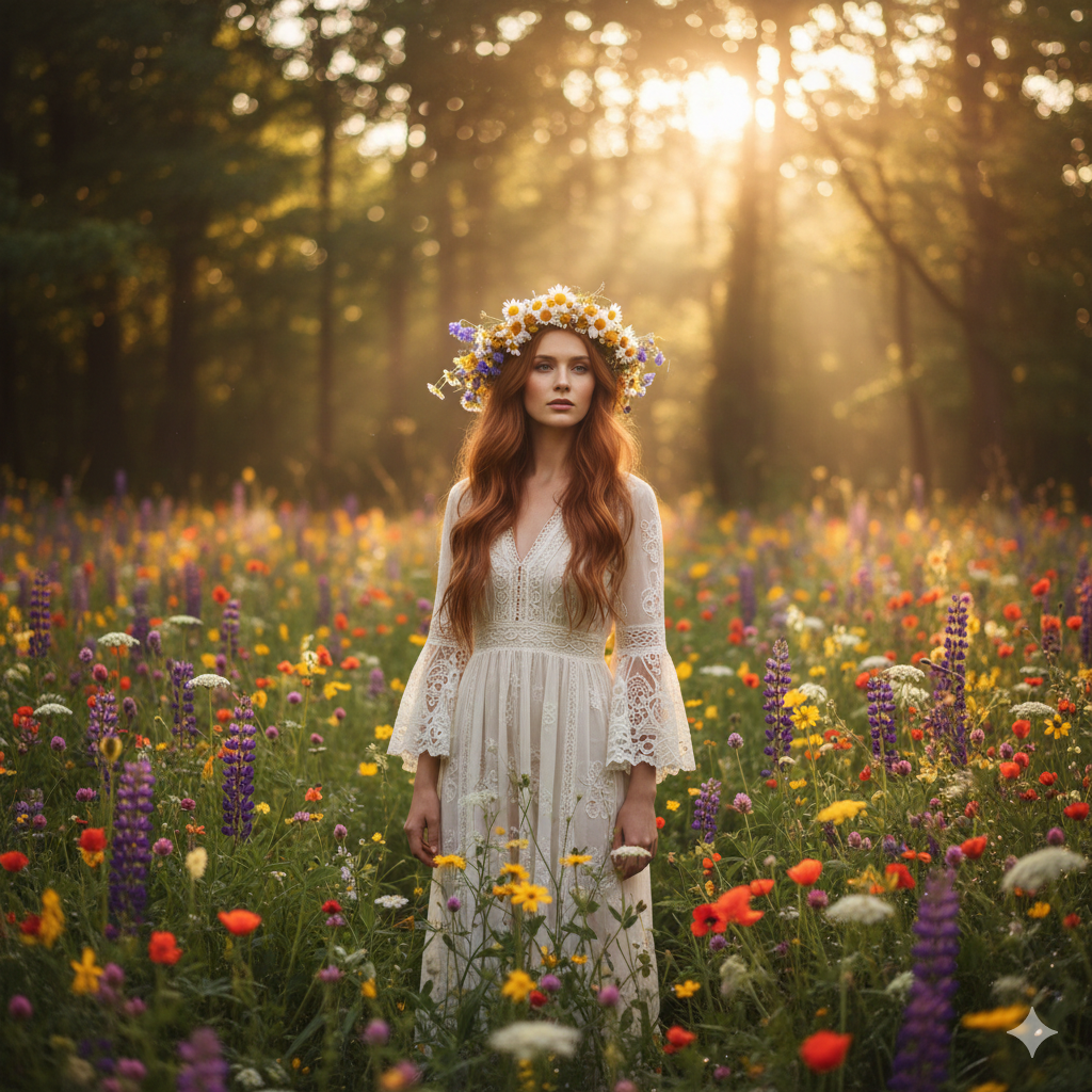 Prompt: “A natural beauty standing amidst a sea of wildflowers, wearing a boho-style dress and a flower crown. The sun shines through the trees, casting soft, warm light over her, creating an enchanting and cinematic feel.”