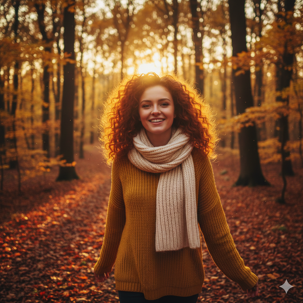 Prompt: “A girl with curly hair, wearing a cozy knit sweater and scarf, walking through a vibrant autumn forest. The fallen leaves create a colorful carpet on the ground, while a golden sunset lights up the scene.”