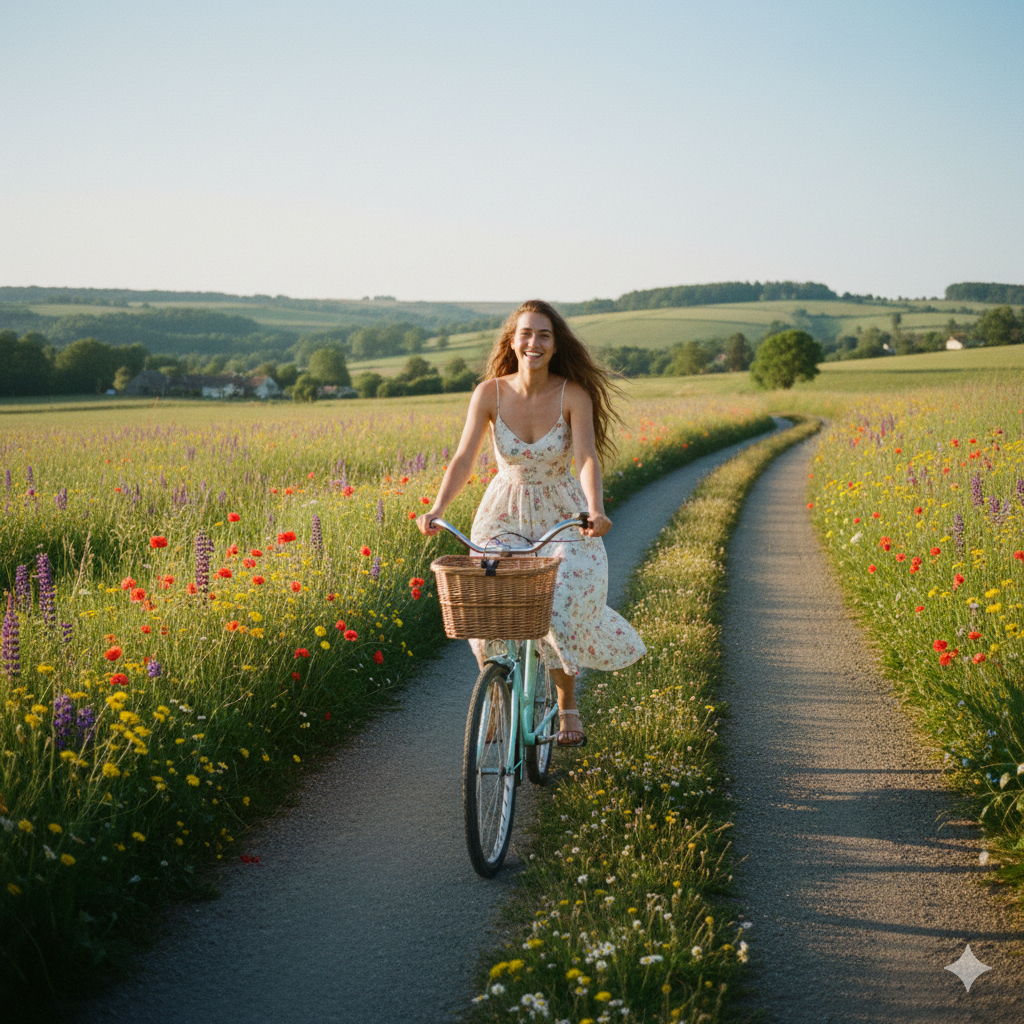 Prompt: “A young woman with a carefree smile, riding a vintage bicycle through a charming rural path lined with wildflowers. The scene is bathed in soft sunlight, with the rolling countryside in the distance.”