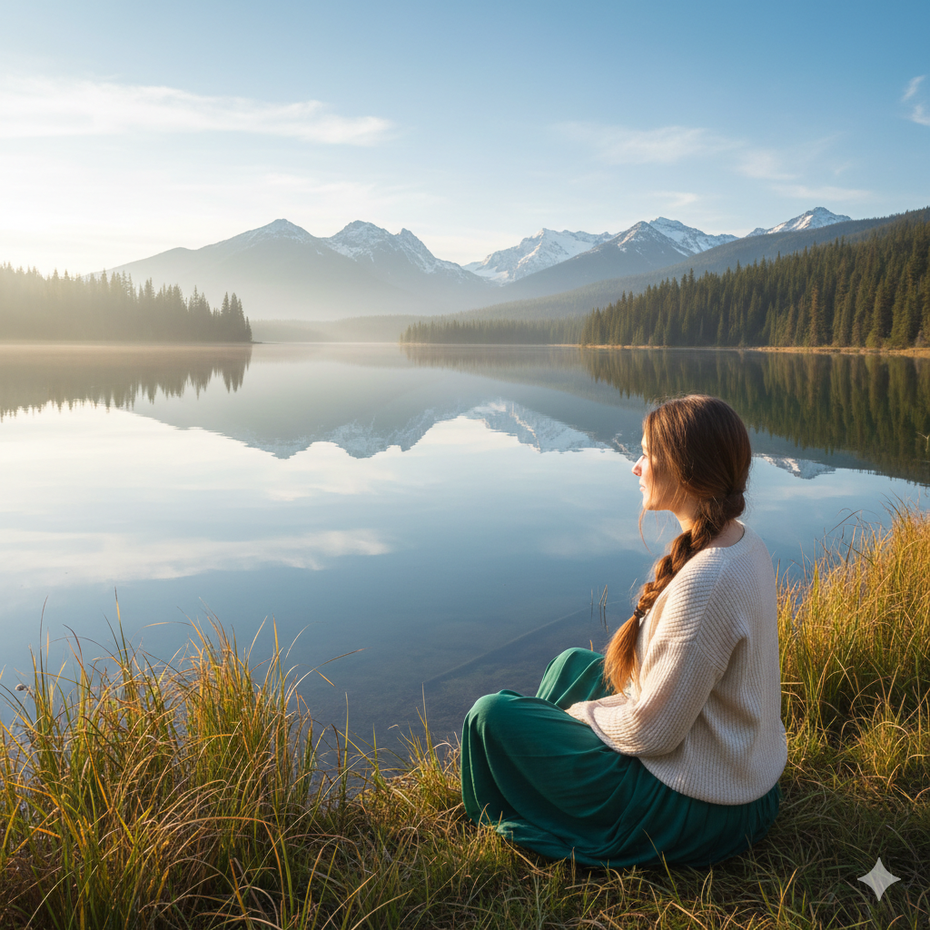 Prompt: “A girl with long hair in a loose braid, sitting peacefully at the edge of a pristine lake surrounded by tall grass. The reflection of the sky and mountains on the still water adds to the tranquility of the scene.”
