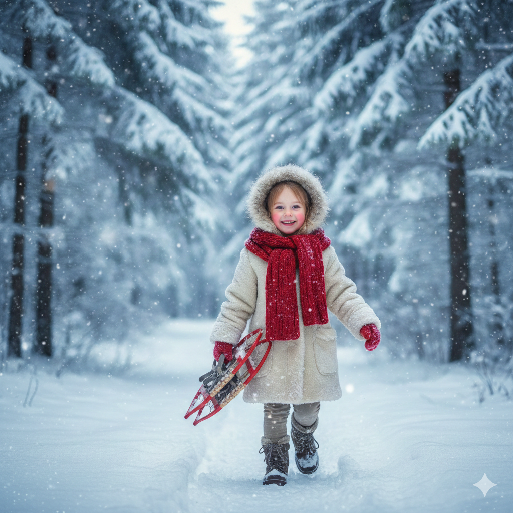 Prompt: “A girl with rosy cheeks and bright eyes, bundled up in a cozy coat and scarf, walking through a snowy forest. The background features tall snow-covered pine trees and delicate snowflakes drifting down from the sky.”