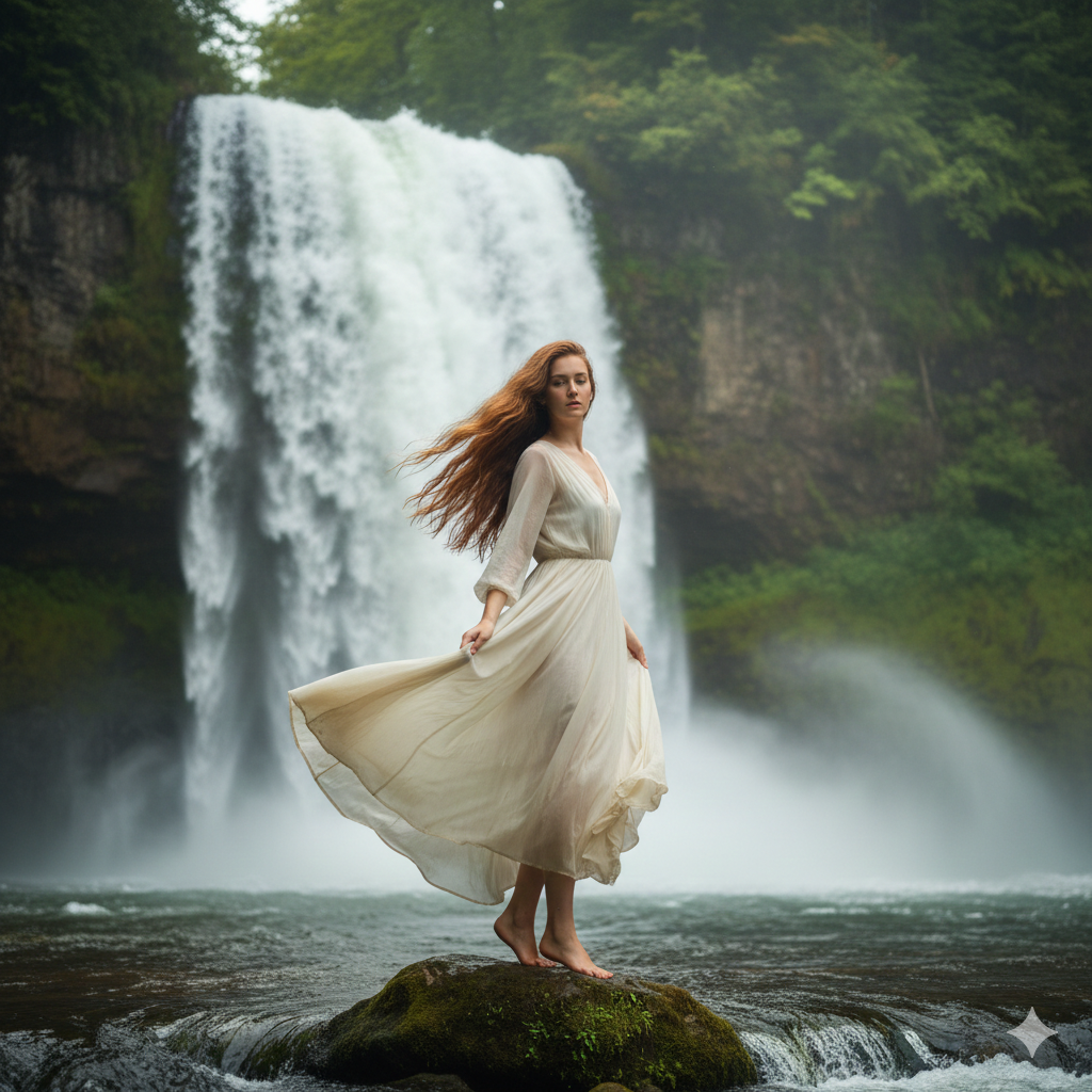 Prompt: “A serene, natural portrait of a girl standing in front of a powerful waterfall, with water cascading down in the background. Her hair is styled in loose waves, and she wears a flowy light-colored dress that dances in the mist.”
