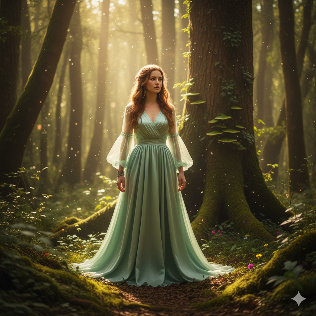 Prompt: “A magical portrait of a girl in a long, ethereal gown, standing in a lush green forest with light filtering through the trees. The soft sunlight creates a dreamy, cinematic glow around her.”