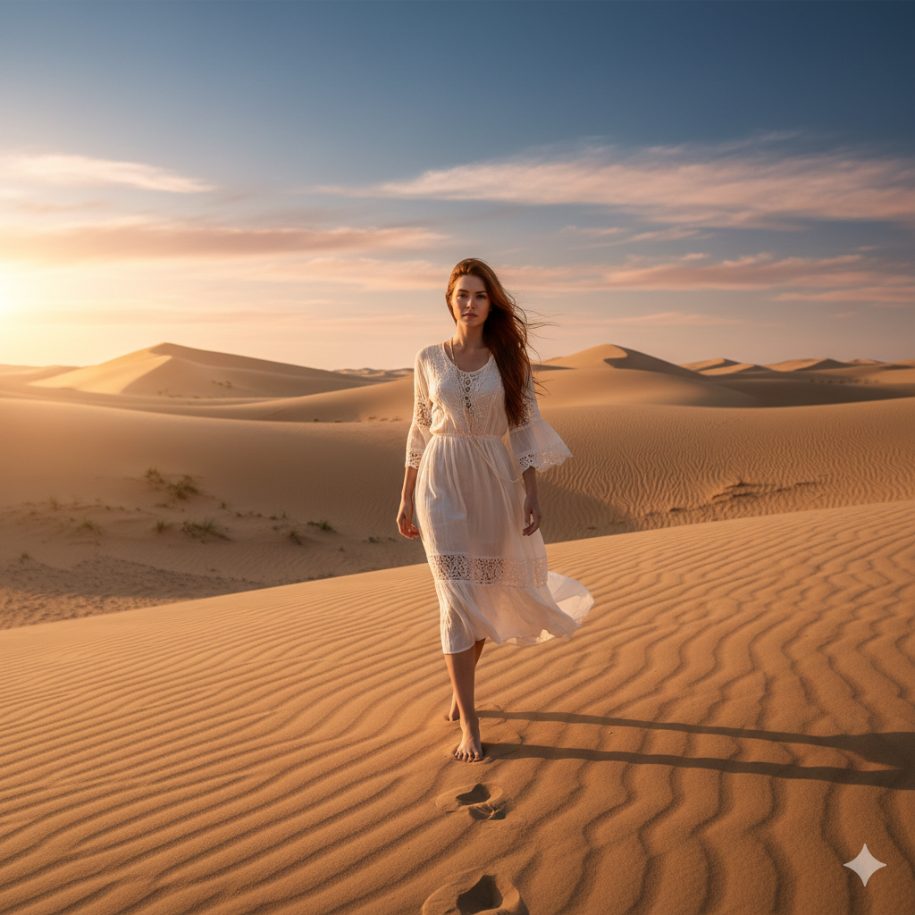 Prompt: “A beautiful woman with sun-kissed skin, wearing a light, airy dress, walking barefoot through a vast desert landscape. The scene is bathed in warm golden light with endless sand dunes stretching out under a clear, blue sky.”