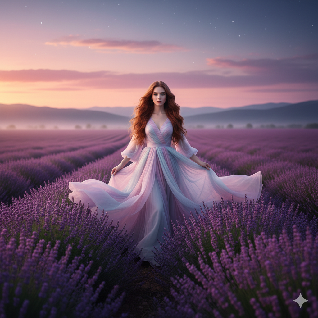 Prompt: “A stunning girl with long, flowing hair, wearing a soft, pastel-colored dress, standing in a field of lavender. The vivid purple flowers contrast with the soft colors of the sky at dusk, creating a tranquil, cinematic atmosphere.”