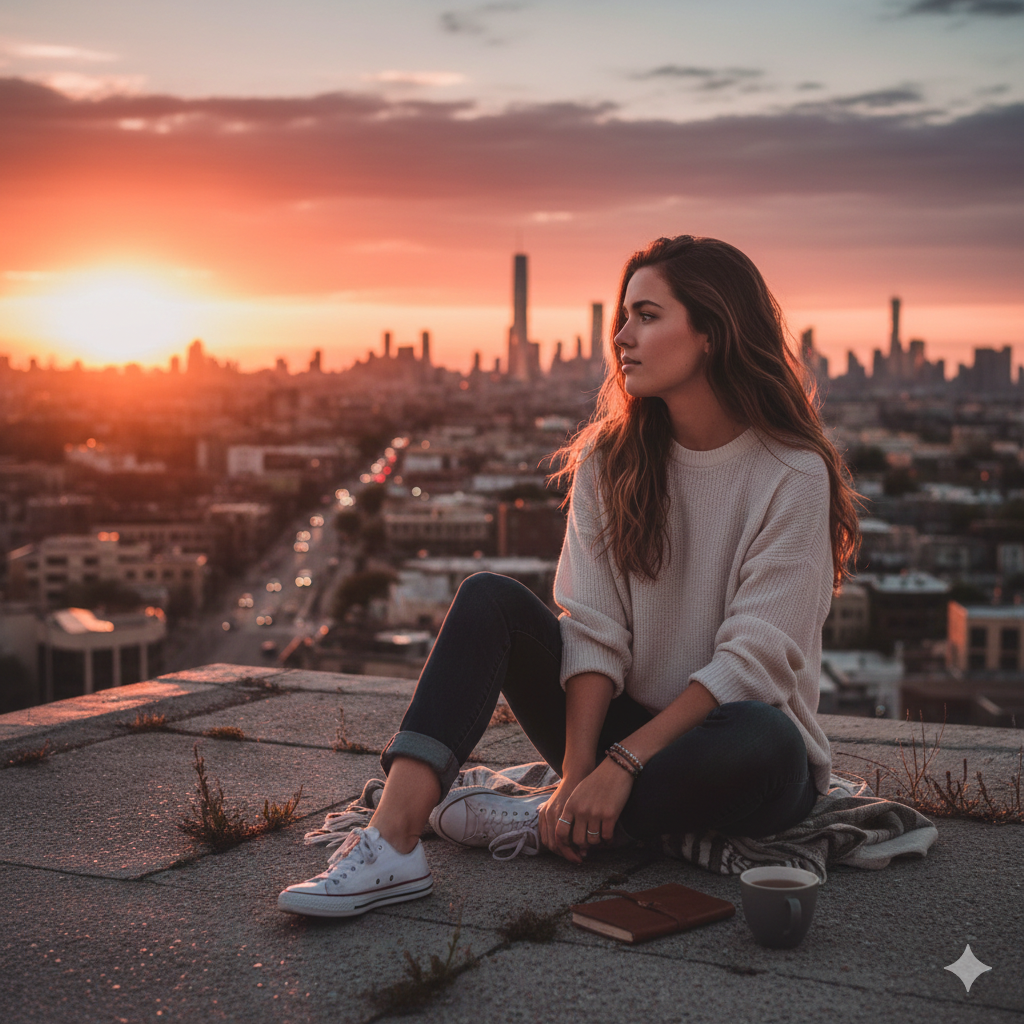 Prompt: “A young woman with a relaxed vibe, sitting on a rooftop during sunset, overlooking the city. Her casual outfit complements the warm hues of the sky, creating a perfect blend of natural beauty and urban life.”