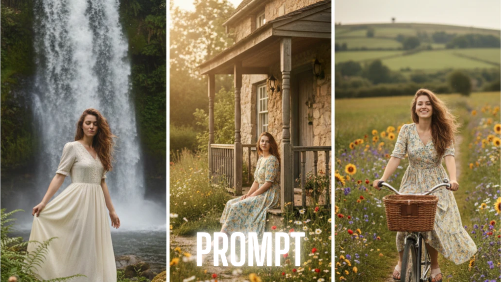 Prompt: “A girl wearing a vintage floral dress, sitting on the porch of a rustic cottage, surrounded by wildflowers and tall grass. The soft golden hour light gives the entire scene a nostalgic, romantic feel.”