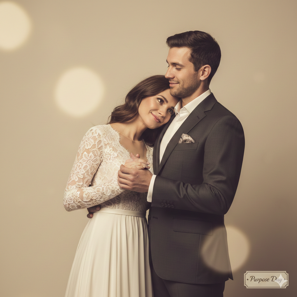Generate a viral-style Purpose Day romantic couple photograph that looks like a real professional DSLR studio shoot. Perfect lighting balance, natural skin texture, emotional facial expressions, premium fashion styling, high dynamic range, cinematic depth, professional wedding photography aesthetics, Ultra-realistic 8K resolution, Gemini AI masterpiece.